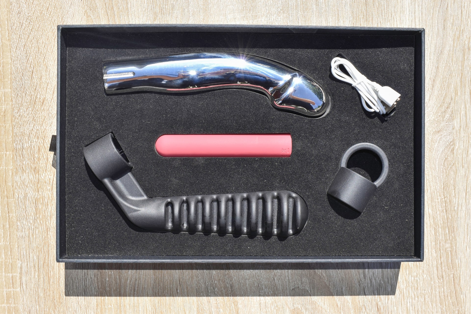 In the box, you will find a flyer saying you have 1-year warranty on the toy, and another flyer showing what’s inside the box, a finger ring, a long-reach handle, a bullet vibrator, and the stainless steel dildo, Capo.