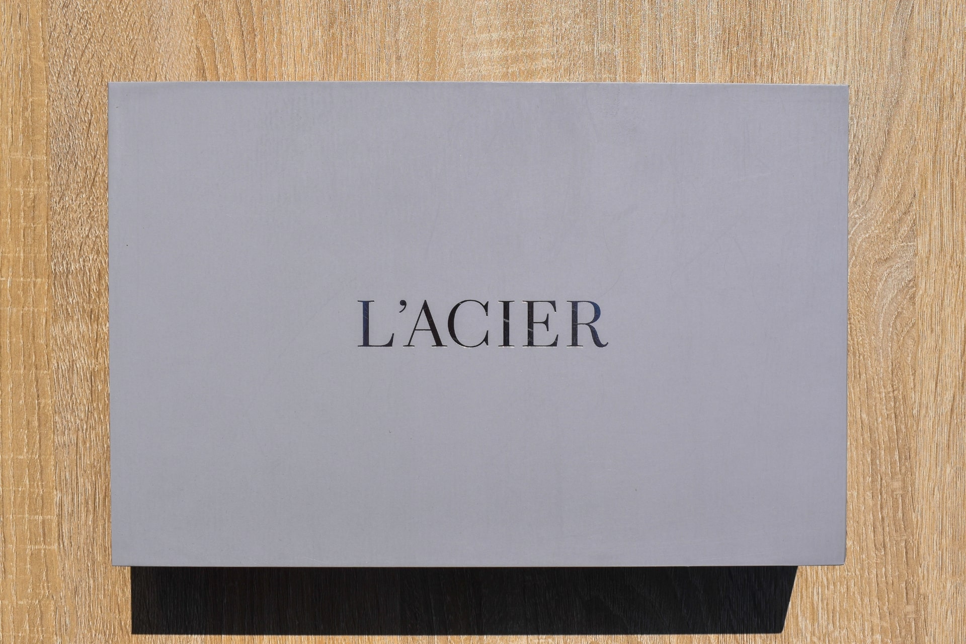 L’acier Capo comes in a big, luxury, hard cardboard box. The box is grey with elegantly written L’acier across the middle.